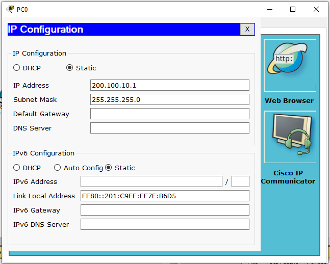 6. Kemudian mengisikan IP pada setiap PC. Terdapat kolom untuk mengisi IP, Subnet Mask, Gateway, dan DNS. Kita isikan saja IP v4 nya, IP v6 nya dibiarkan kosong
