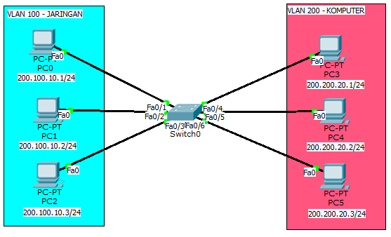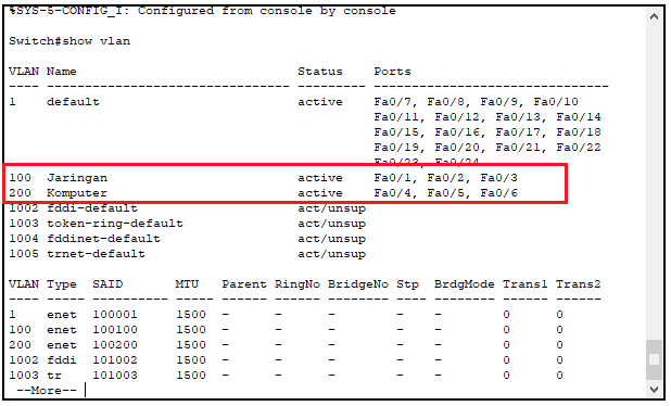 6. Cek hasil konfigurasi dengan perintah show vlan untuk memastikan bahwa port f0/1, f0/2 dan f0/3 sudah menjadi member vlan 100 kemudian port f0/4, f0/5 dan f0/6 sudah menjadi member vlan 200.